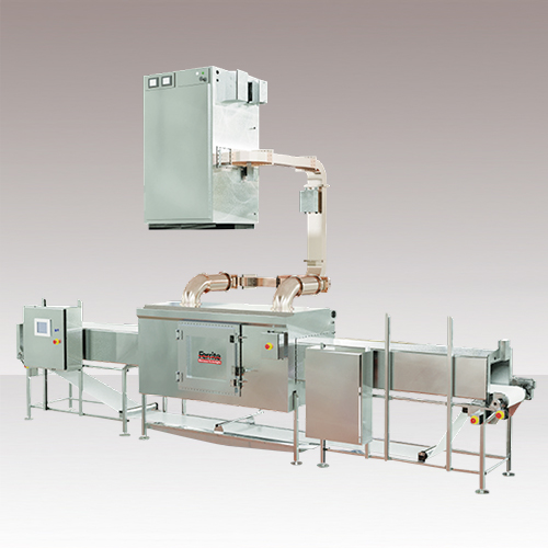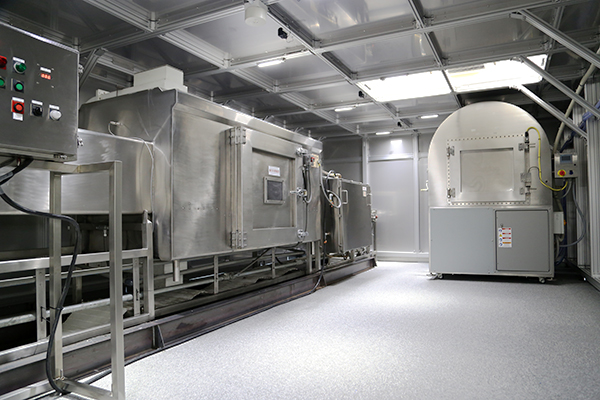 マイクロ波解凍機は、少量解凍に適したバッチ型と、連続大容量の解凍が可能なトンネル式を設置。
